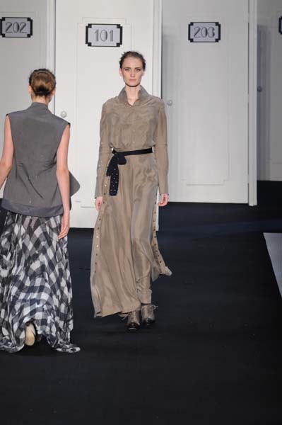 O cenário reproduzia um corredor de hotel com ar de mistério. As roupas mostravam forte influência do universo masculino com um toque de sensualidade. Os looks eram sofisticados e monocromáticos – na paleta de cores os tons sóbrios, como cinzas e pretos, foram bastante explorados. A estampa xadrez também esteve presente.